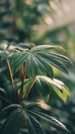 A detailed photograph of a single Cassava, swaying gently in the wind, captured in natural daylight. Fresh and airy atmosphere, soft motion blur on leaves, crisp details on textures, background softly blurred into natural greenery, cinematic natural light, realistic photography.