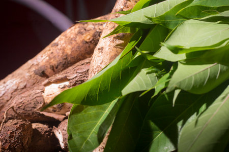 A bunch of raw, newly harvested Cassava root with side lighting, selective focus and blurred background