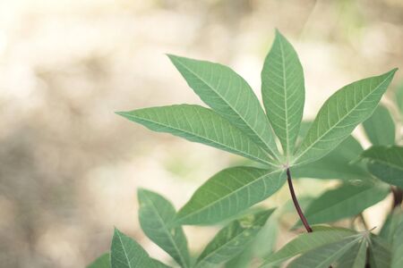 detailed closeup of fresh green cassava leaves with natural background in tropical farmland
