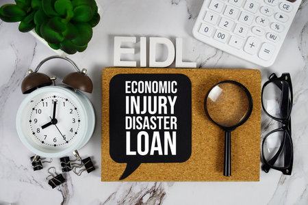 EIDL - Economic Injury Disaster Loan acronym with calculator, alarm clock and magnifying glass, Business and Financial concept background