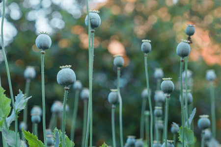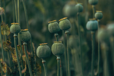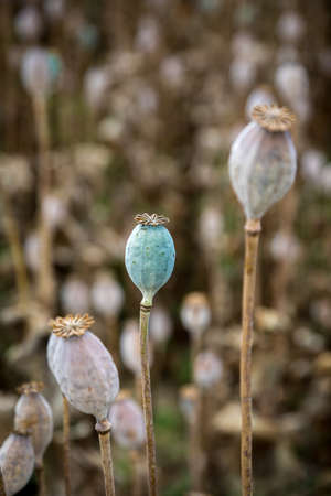 Opium poppy unripe capsules in cultivated field, selective focus