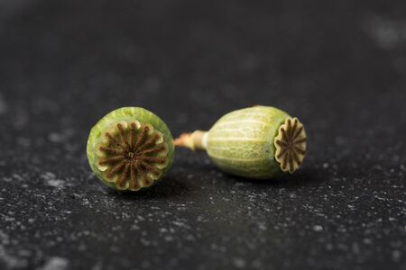 Green opium poppy (Papaver somniferum) heads on green background