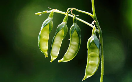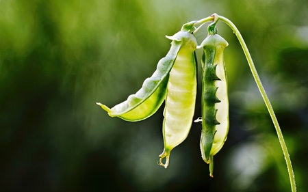 Floating in a serene green space, these vibrant pea pods create a dynamic and harmonious visual. Capturing a sense of freshness and natural beauty, this Generated AI image evokes tranquility