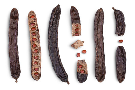 Ripe carob pods and bean isolated on white background with clipping path and full depth of field. Top view. Flat lay. Set or collection