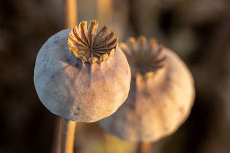 Dried poppy head selective focus. Opium drugs plant head.