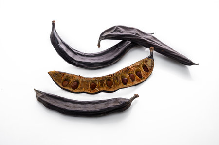 Healthy organic sweet carob pods with seeds on white background