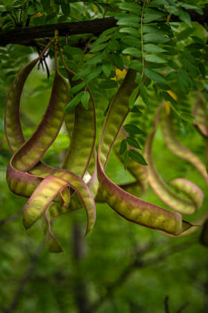 Close up of the long red pods of a honey locust on a sunny day in springtime