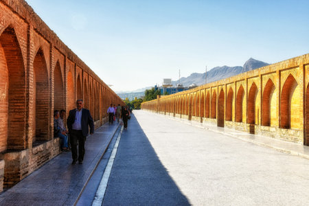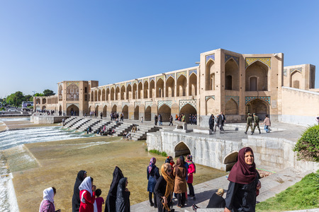 Isfahan, Iran - October 03, 2015: Iranian people walk on Allahverdi Khan Bridge called Siosepol over Zayandeh