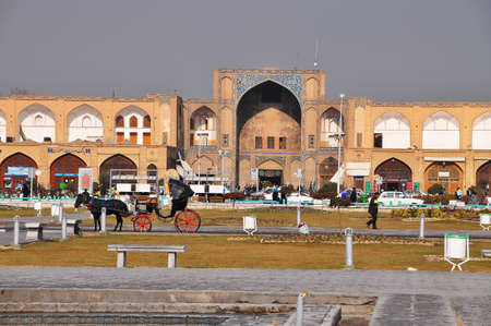 Isfahan, IRAN - May 1 2019: People having a horse ride in Naqsh-i Jahan Square in a sunny day