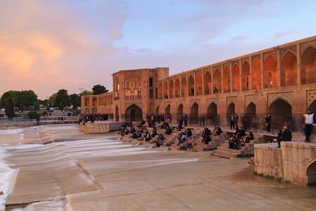 ISFAHAN IRAN APRIL 28 2015: unidentified people resting in the ancient Khaju Khaju Pole Bridge in Isfahan Iran