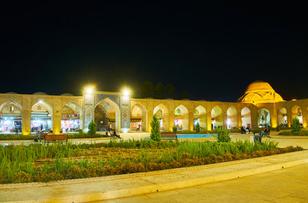 KERMAN, IRAN - OCTOBER 15, 2017: Ganjali Khan Square of the Grand Bazaar is surrounded by brick arcades and decorated with greenery, it's nice place for the evening walks, on October 15 in Kerman.