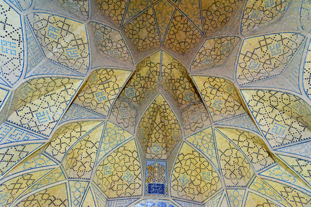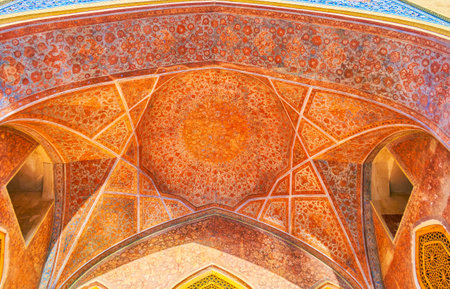 ISFAHAN, IRAN - OCTOBER 19, 2017: The painted ceiling of the portal in Chehel Sotoun Palace, on October 19 in Isfahan