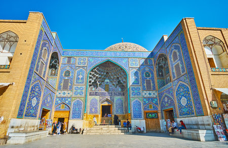 ISFAHAN, IRAN - OCTOBER 21, 2017: The richly decorated half-moon recessed gateway of historic Sheikh Lotfollah mosque is covered with ornate Persian tiling, on October 21 in Isfahan.