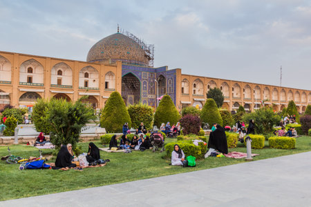 ISFAHAN, IRAN - JULY 10, 2019: People having picnic in front of the Sheikh Lotfollah Mosque at Naqsh-e Jahan Square in Isfahan, Iran