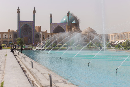 Isfahan, Iran - March 21, 2018: Iranian people rest rest near fountain at Naghsh-e Jahan Square