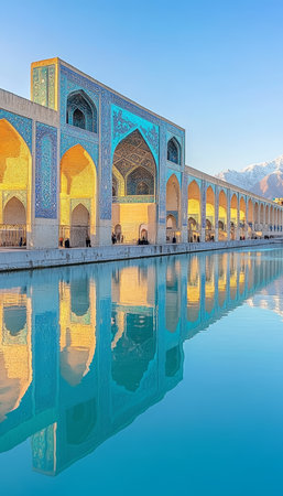 Majestic View of Naqsh-e Jahan Square with Golden Arches, Reflections, and Snow-Capped Mountains