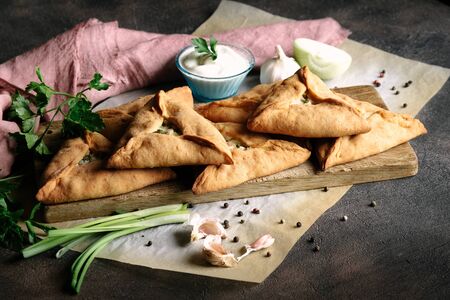 Triangle meat or chicken pie with potatoes, sour cream, onions, garlic and spices on a dark background. Echpochmak Tatar traditional dish.