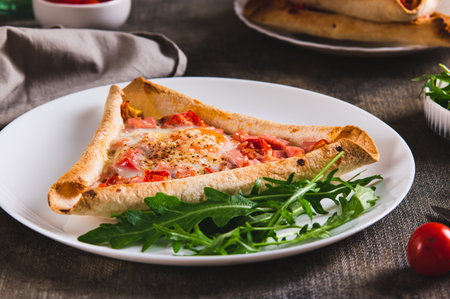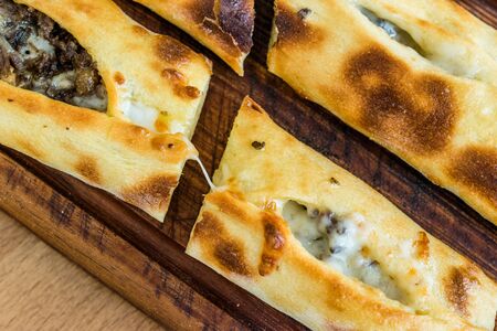 Traditional turkish baked dish pide. Turkish pizza pide, Middle eastern appetizers. Turkish cuisine. Pita with meat filling
