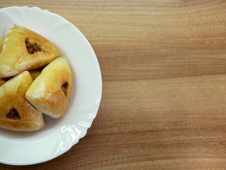 Closeup view on pies with meat filling. White plate stands on wooden surface with baked pies. Tasty traditional snack.