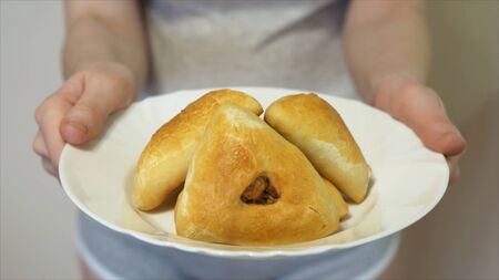 Closeup view on pies with meat filling. Woman holds white plate with baked pies. Tasty traditional snack.
