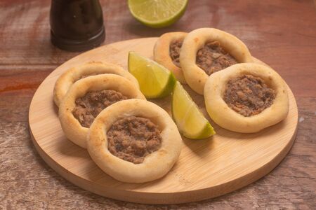 Arabic Meat sfiha over a wooden table. Esfiha or Esfirra. Manakish