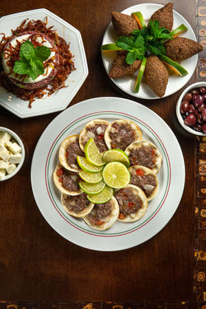 Traditional Middle Eastern food. Lebanese Sfiha meat. Arabian sfeeha plate. Esfiha with lemons. Kibbeh Kibe. Top View