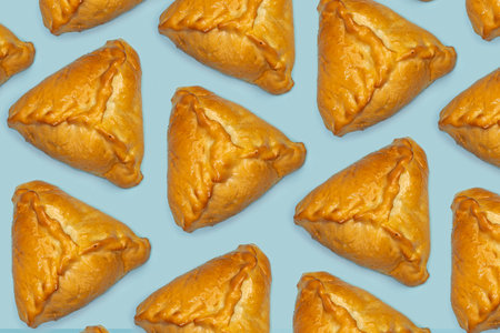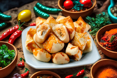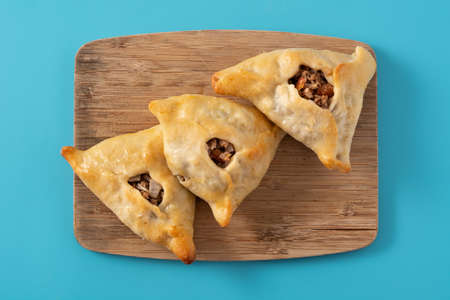 Ocpochmaq, triangular pastry, filled with minced beef, onion and potatoes., Tatar national cuisine, Traditional assorted Asia dishes, Top view.