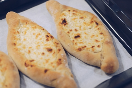 Freshly baked traditional khachapuri. Georgian cheese bread. Georgian food