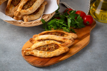 Dishes from traditional Turkish cuisine; Mini pita with minced meat - Turkish name; Minced meat mini pita