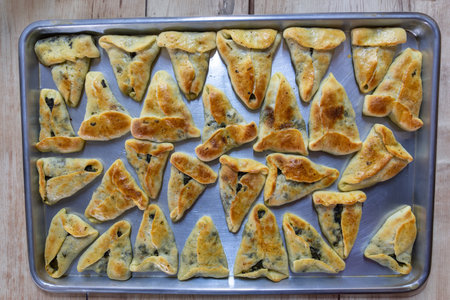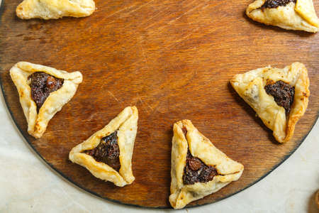 Hamantaschen cookies or hamans ears for Purim holiday celebration . top view.