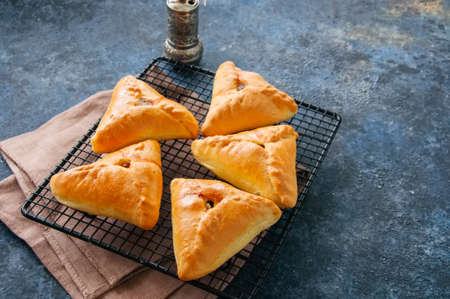 kulebyak or khachapuri. triangular pie with filling on a blue table. Traditional pastries of Central Asia or Russia.