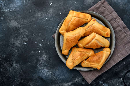 Triangle meat or chicken pie with potatoes, sour cream, onions, garlic and spices on a dark background. Echpochmak Tatar traditional dish. Top view.