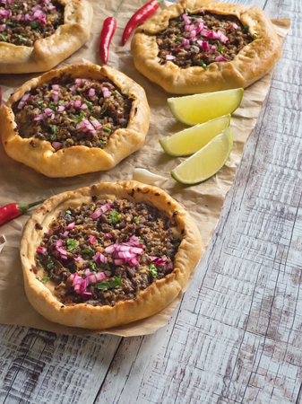 Sfiha, kind of pie like originating in Syria and Lebanon and widely consumed in all the world, on rustic wooden table.