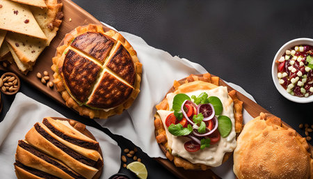 A captivating still life featuring an array of savory pastries, showing their diverse fillings and textures. The warm tones and meticulous presentation invite viewers to savor the culinary delight.