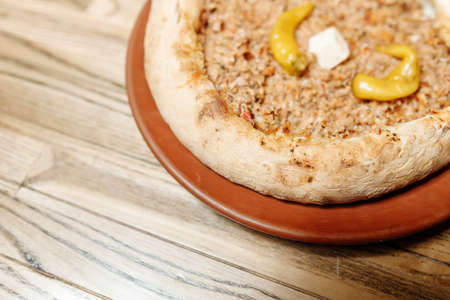 Turkish pizza with butter on the showcase of the cafe. Pizza with baked tomato sauce, meat, mushrooms and herbs