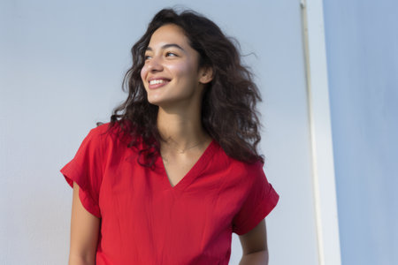 One positive woman portrait against the wall