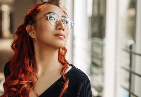 Beautiful smiling asian woman, wearing glasses, posing smiling and looking at camera, happy asian woman smiling indoors