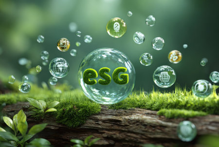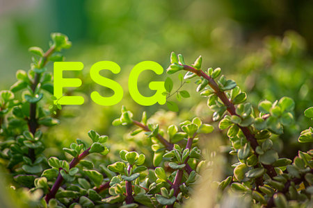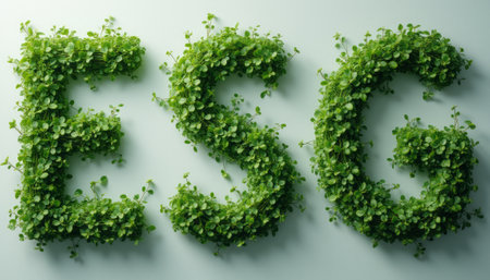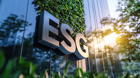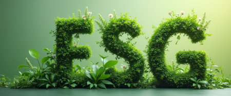 Sleek ESG letters surrounded by greenery reflect sustainability and innovation.