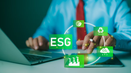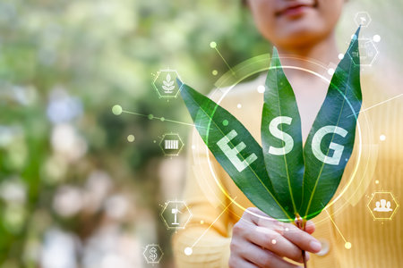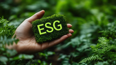 Sustainable practices are highlighted with hand holding ESG sign.