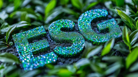 Sustainable ESG letters with green glitter among leaves.