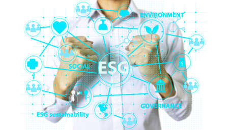 Businessman touching ESG Environmental Social Governance virtual screen Internet Business Technology Concept.