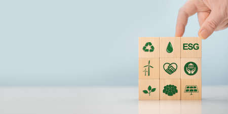 ESG concept of environmental, social and governance. words ESG on wood block. Hand holds wooden cubes with abbreviation ESG standing with other ESG icons