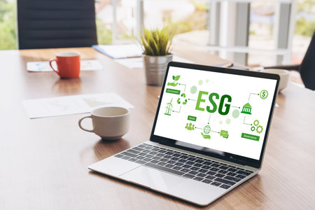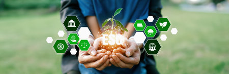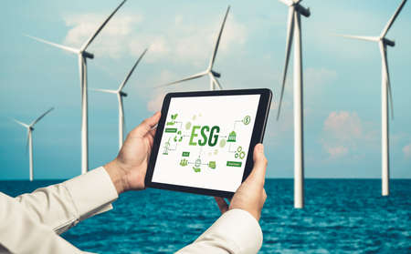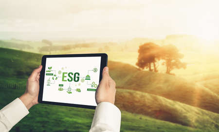 ESG on environment, society and governance, sustainable organizational development Environmental considerations for the environment global and ethical business, educed impact awareness of resources.