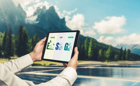 ESG concept. Environmental, social and governance in sustainable and ethical business. Smartphone in hand. Ecology care