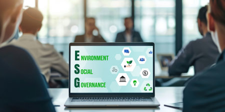 Business Meeting on ESG. Professionals analyzing sustainability metrics and strategies in an office.