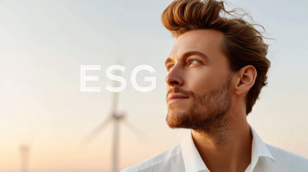 A close-up portrait of a confident, young businessman with a beard, set against a backdrop of wind turbines and the ESG text, bathed in the warm light of sunrise or sunset. This image captures the optimistic spirit of the next generation of leaders committed to environmental and social governance, suitable for HR, recruitment, and corporate branding.
