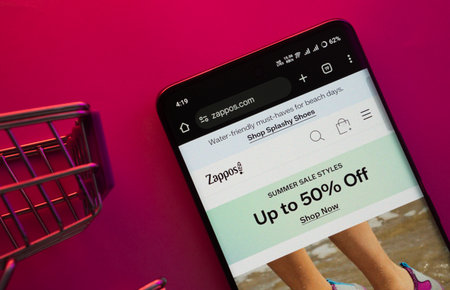 Dhaka, Bangladesh- 23 June 2025: A smartphone displaying the Zappos website with a shopping cart is shown on a vibrant background.
