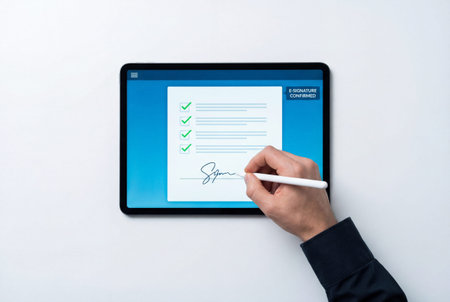A male hand uses a stylus to sign a digital contract on a tablet screen showing green checkmarks and an electronic confirmation message on a white desk.