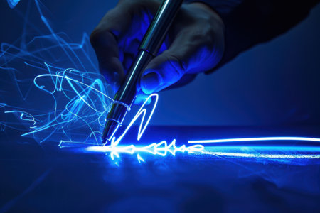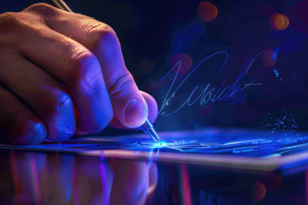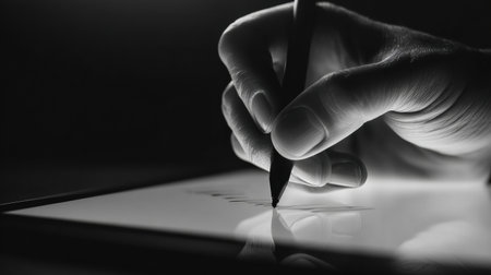 A hand grips a digital pen as it writes a message on a tablet, showing creativity and modern technology in a minimalistic setting.