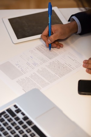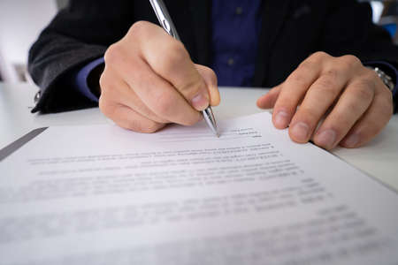 Macro shot of business person signing contract. Unrecognizable worker signing document with ballpen. Person using pen for notes in financial document. Closeup signed business contract.